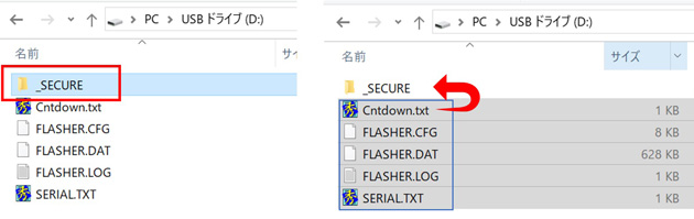 Flasher本体をMSDモードでパソコンに接続して、本体ディスクのルートフォルダに「_SECURE」フォルダを作成します。セキュアエリアに設定するプロジェクトデータファイル(CFG、DAT、Cntdown.txtなど)をすべて「_SECURE」フォルダに移動します。